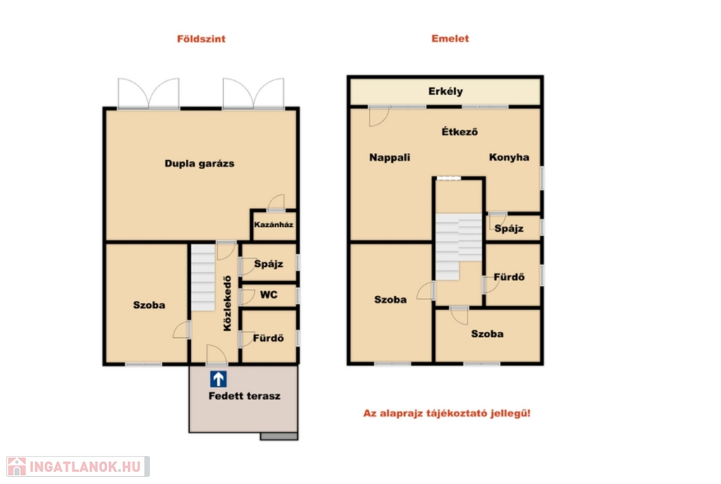 - Földszinten kialakításra kerület: szoba, közlekedő, fürdőkádas fürdő, külön WC, kazánház, dupla garázs, spájz, amely alatt pince található és 12 m2-es fedett terasz.