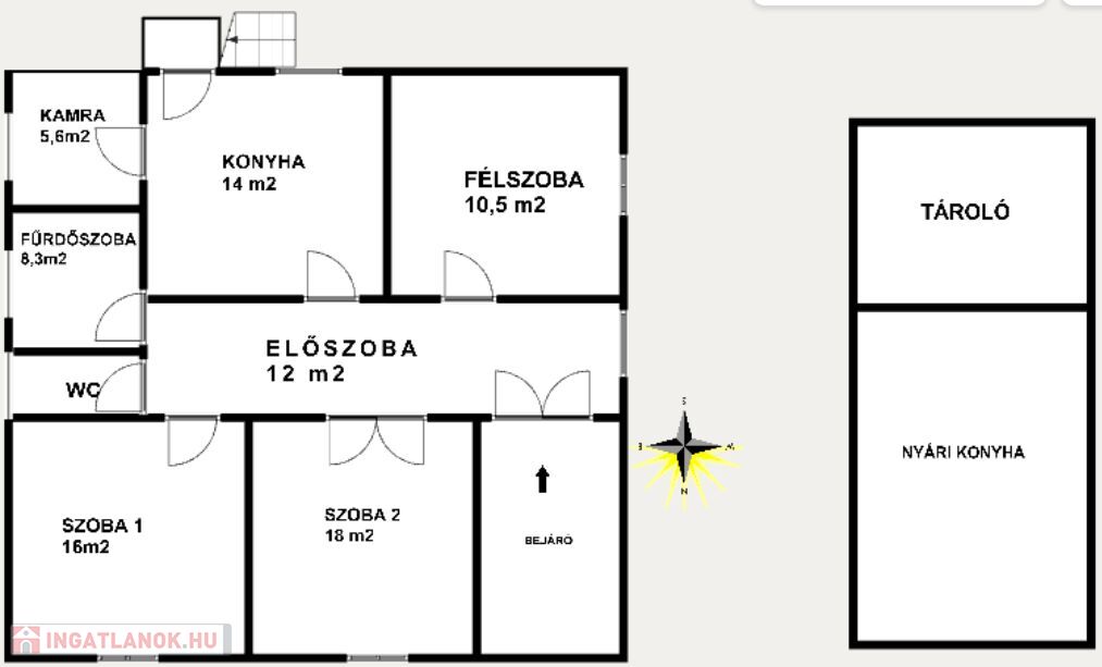 Kettő egész és egy félszoba mellett, külön konyha, fürdőszoba és wc található a házban.