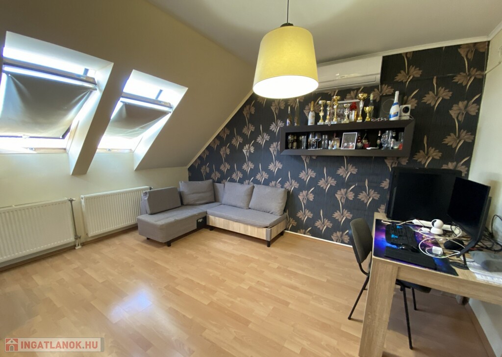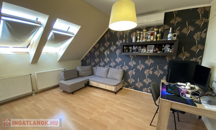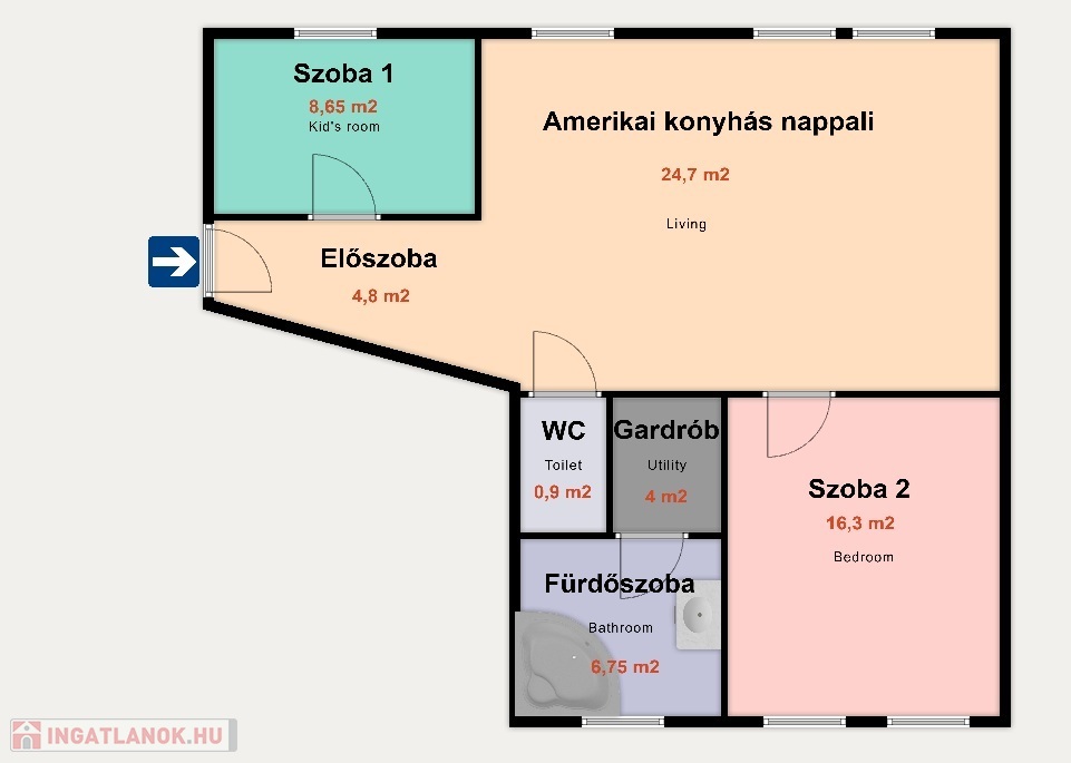 Az ingatlanban található 2 szoba, egy amerikai konyhás nappali, fürdőszoba sarokkáddal, külön wc és egy gardrób.